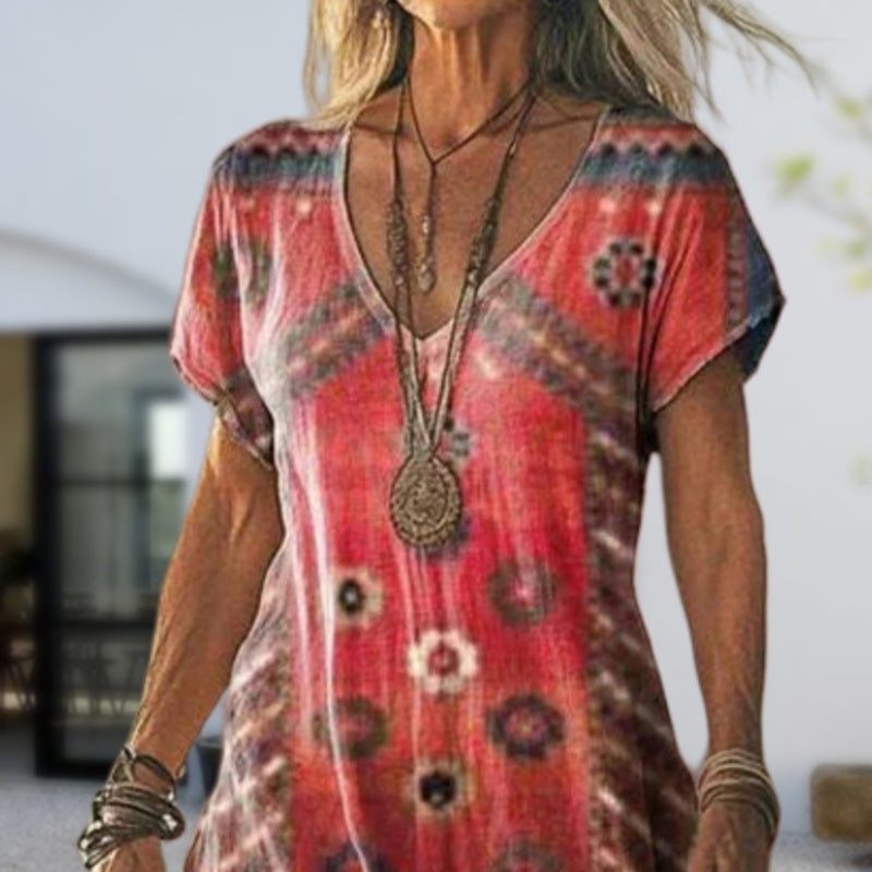✨Γυναικείο Φόρεμα με Κοντά Μανίκια και Στάμπα με V Λαιμόκοψη-GR