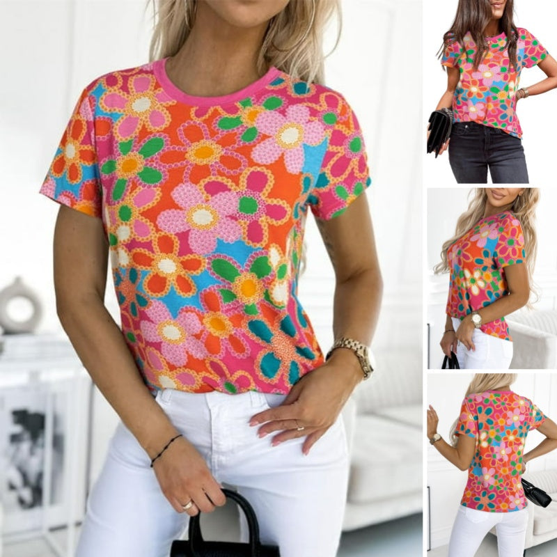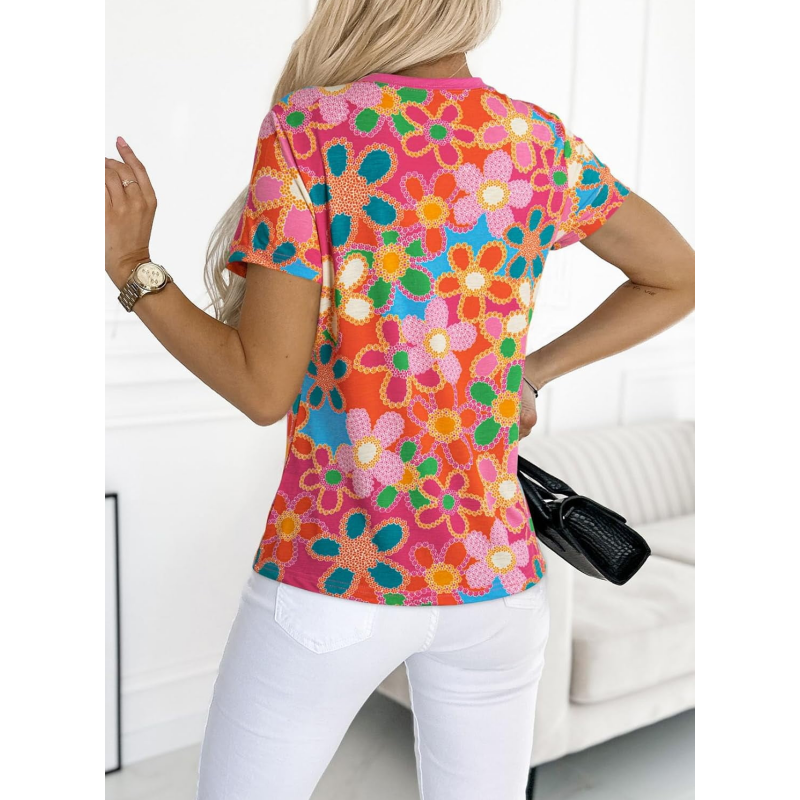 Αυτό το ροζ μπλουζάκι με φλοράλ στάμπα διαθέτει ένα όμορφο και έντονο φλοράλ μοτίβο, που προσθέτει μια θηλυκή και μοντέρνα πινελιά στην καθημερινή σας γκαρνταρόμπα. Ιδανικό για να αναβαθμίσετε το στυλ σας σε κάθε περίσταση.