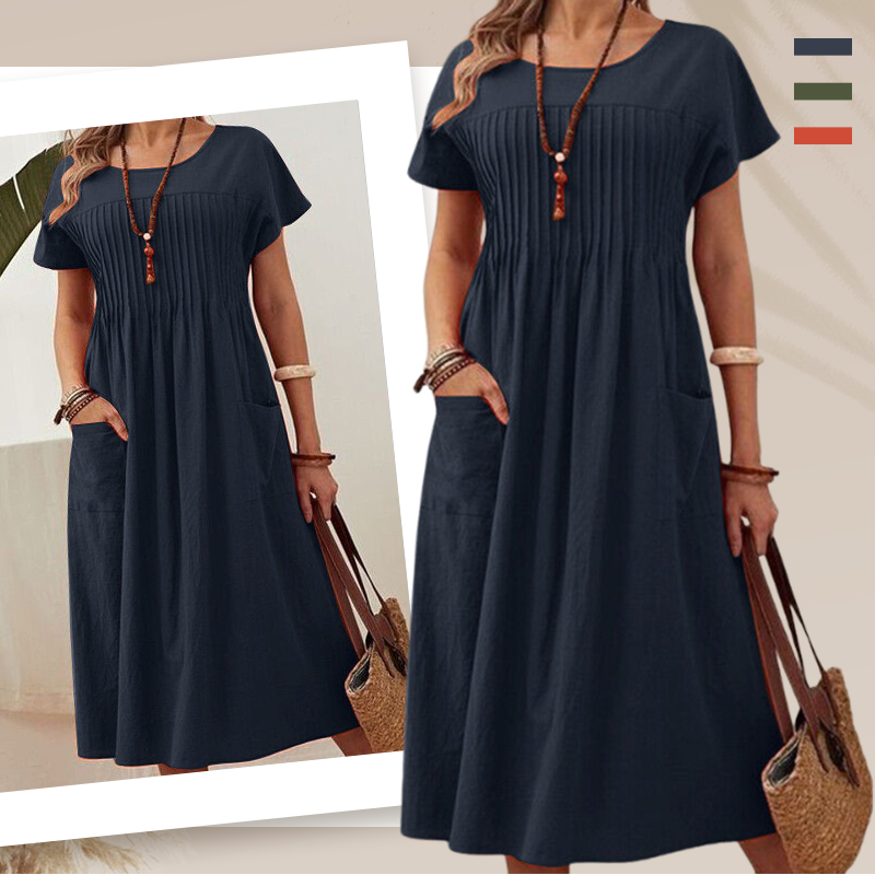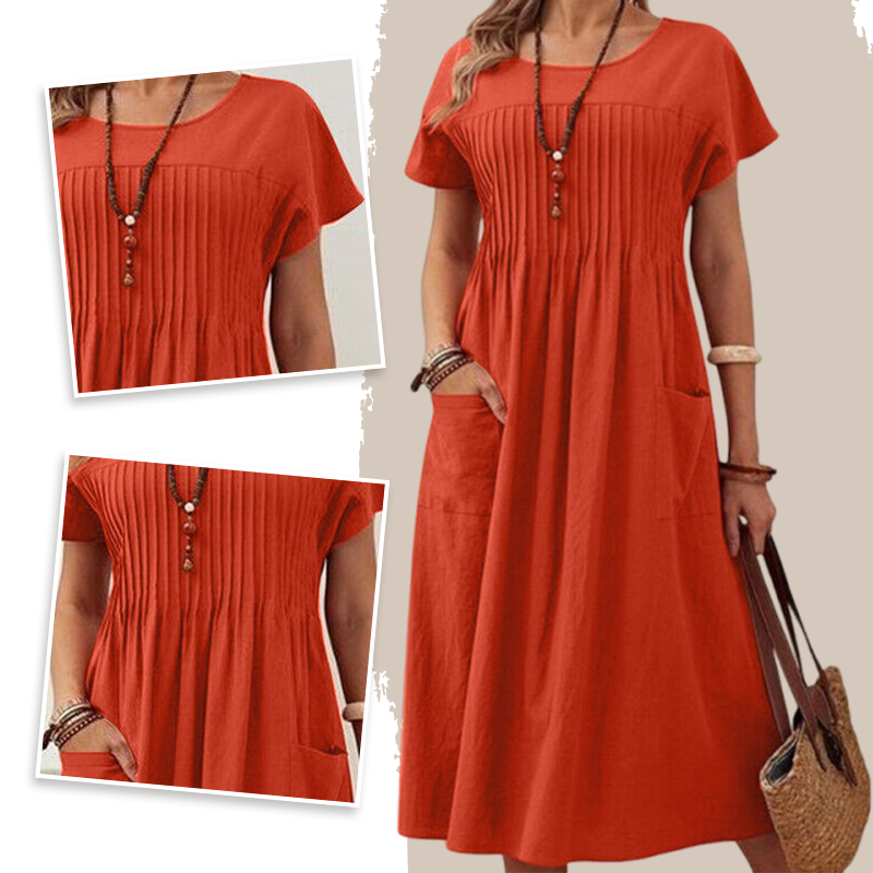 Γυναικείο πλισέ φόρεμα με κοντά μανίκια και τσέπες-GR