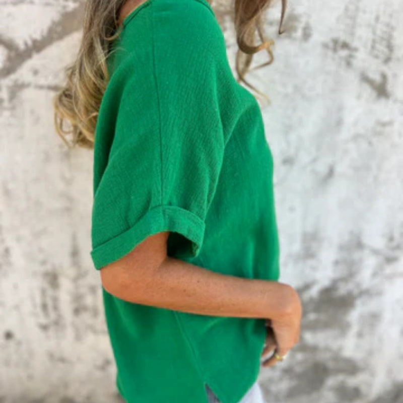 Pakuotės turinys: 1 * Vienspalvė palaidinė apvalia apykakle trumpomis rankovėmis