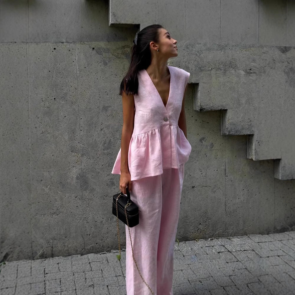 V kombinaciji s širokimi lanenimi hlačami vam bo ta komplet zagotovil ležeren, a eleganten videz, popoln za tople dni. Nežna pastelno roza poudarja njen eleganten in naraven čar. Zaradi zračne lanene tkanine je oblačilo idealno za priložnostne izlete, počitnice ali poletne malice.