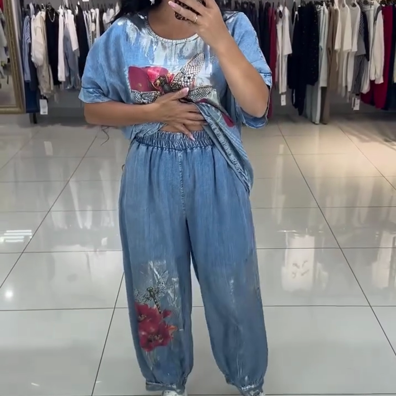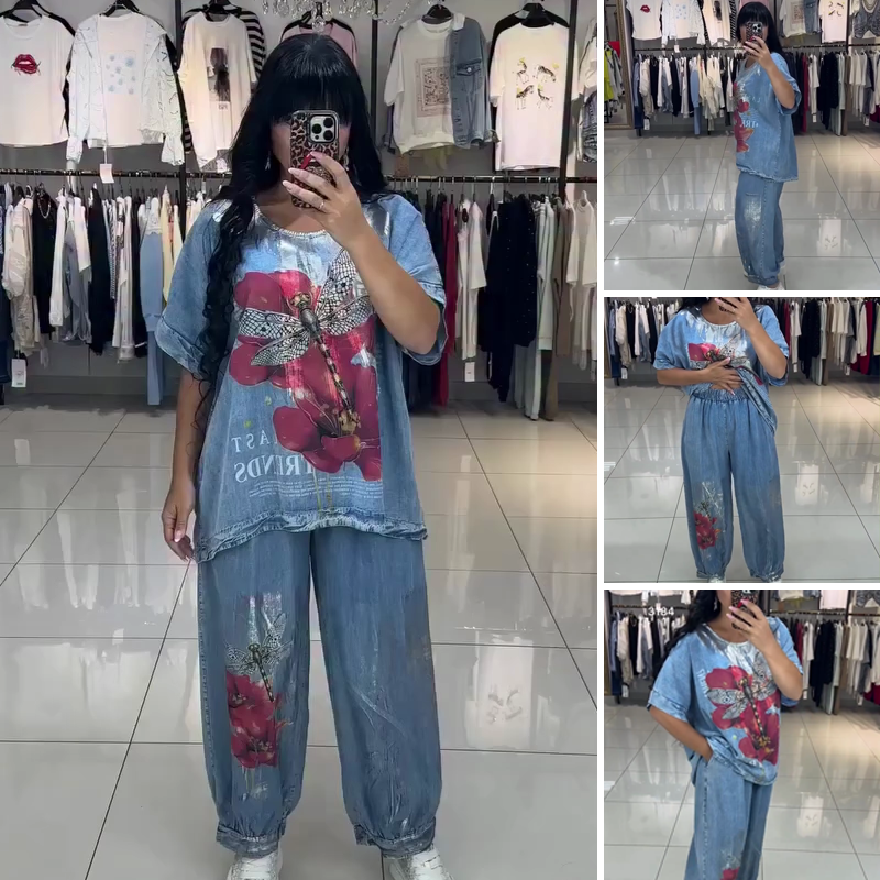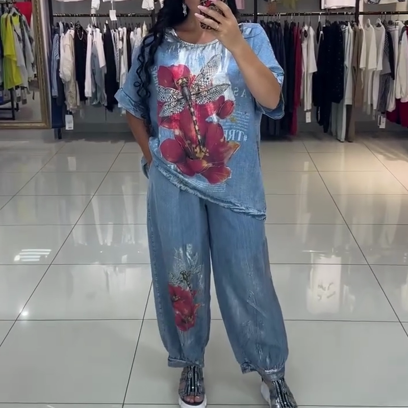ΦΩΤΕΙΝΟ ΣΧΕΔΙΟ ΕΚΤΥΠΩΣΗΣ – Αυτό το σετ διαθέτει εντυπωσιακά σχέδια με κόκκινα λουλούδια και λιβελούλες. Αυτά τα έντονα σχέδια στο μπλε κοντομάνικο τοπ και στο ασορτί φαρδύ τζιν δημιουργούν μια διασκεδαστική και κομψή εμφάνιση, προσθέτοντας μια μοναδική πινελιά στο ντύσιμό σας.