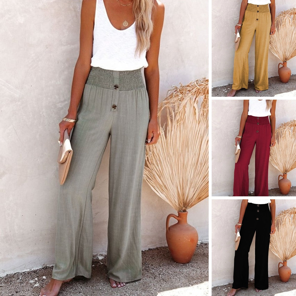 Savybės:  Moteriškos kelnės vientisos spalvos, elastingas juosmuo, plačios kelnės, sagos moterims, vasarinės kelnės, patogios ir prašmatnios.
