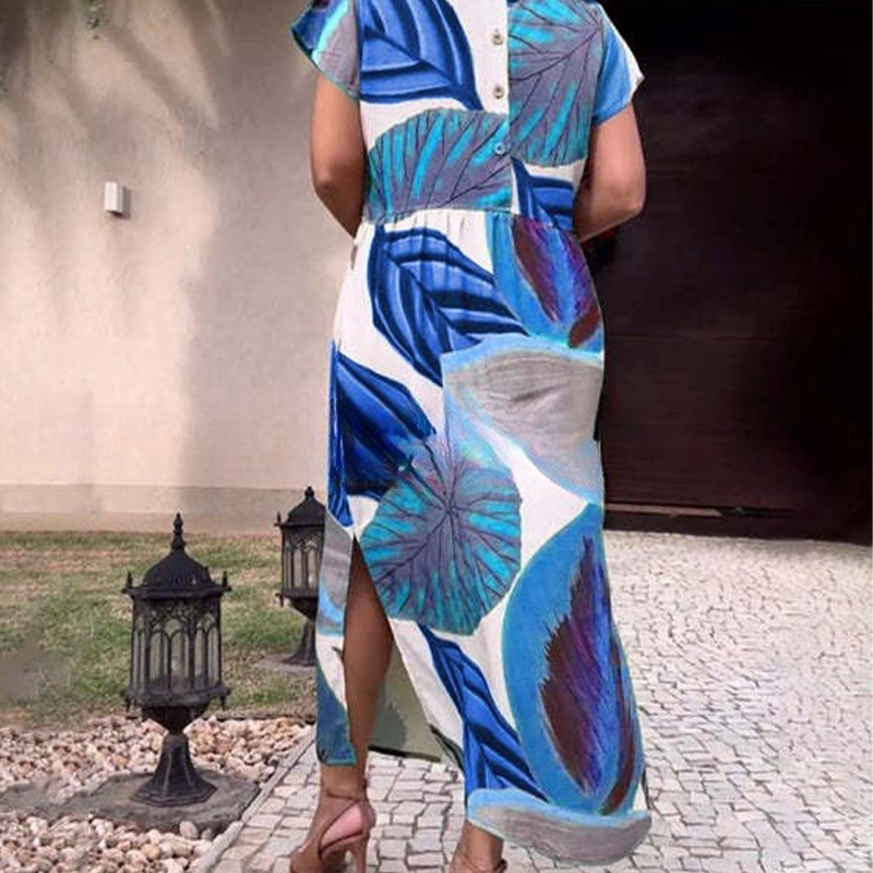 🌸 Spaustuotos šoninės skeltukų suknelės trumpomis rankovėmis moterims-LT